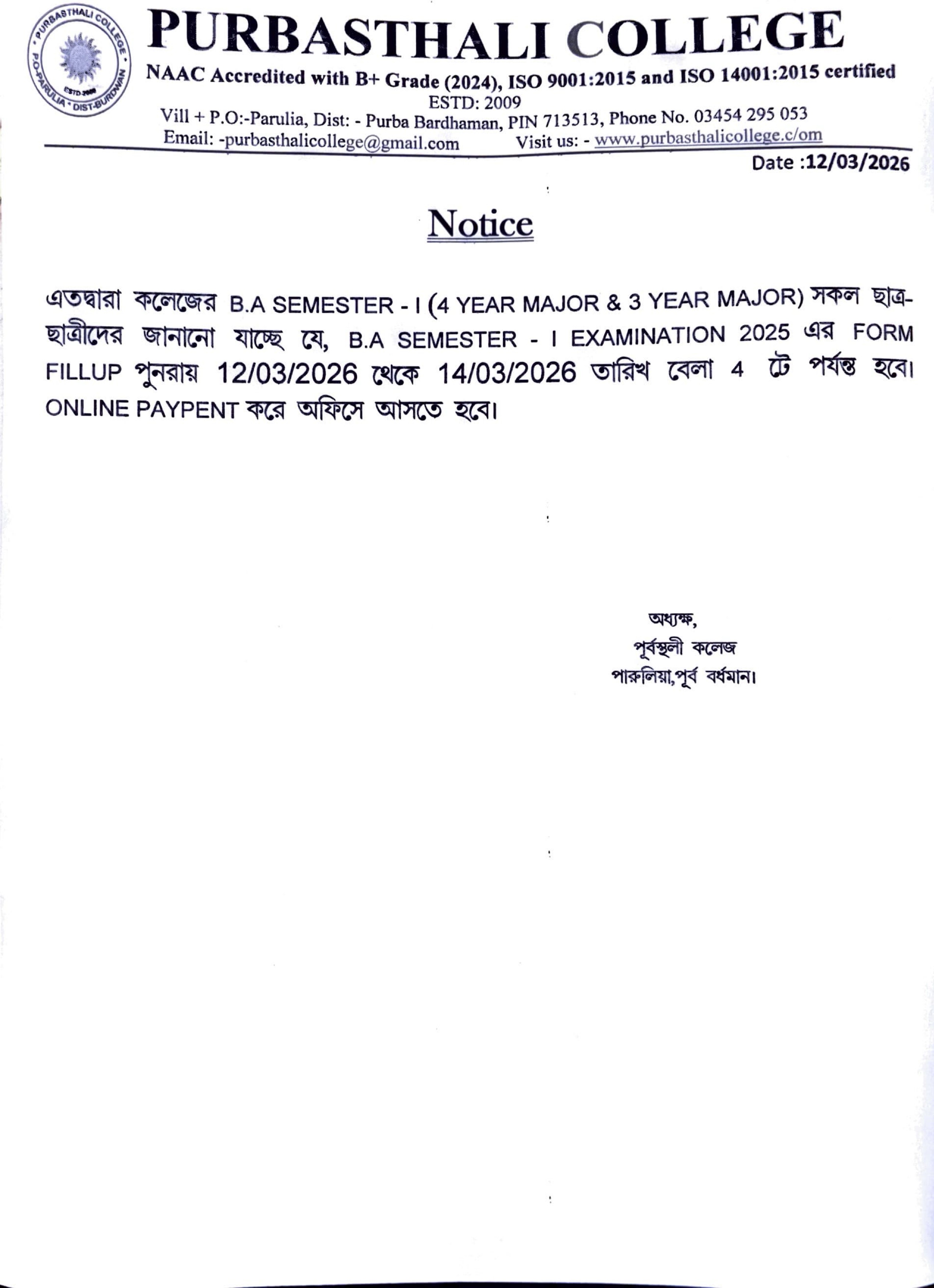 Notice for Examination Form Fill up Semester I (Rescheduled )