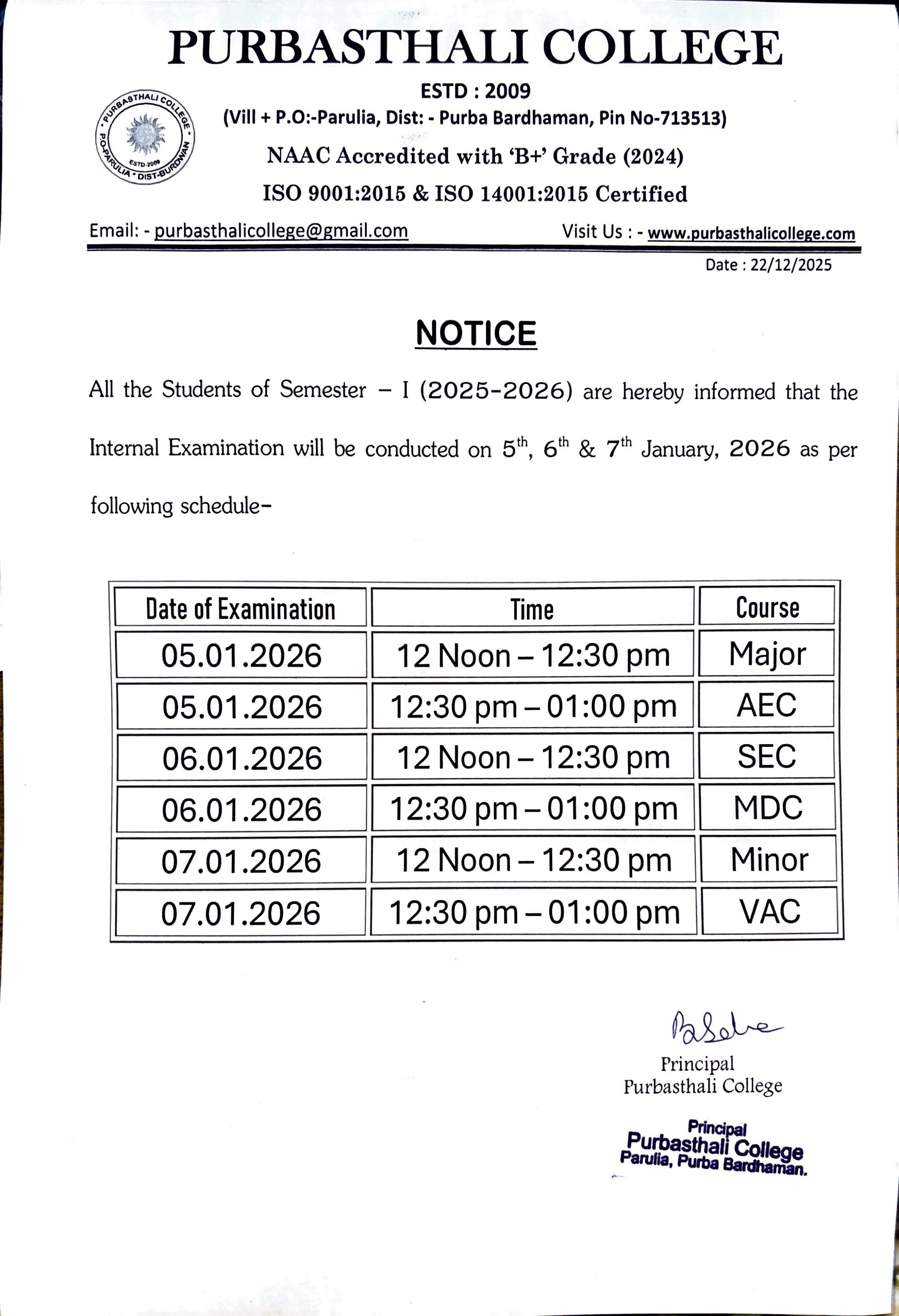 Notice for Sem-5(25-26) Internal Exam & Internship Classes